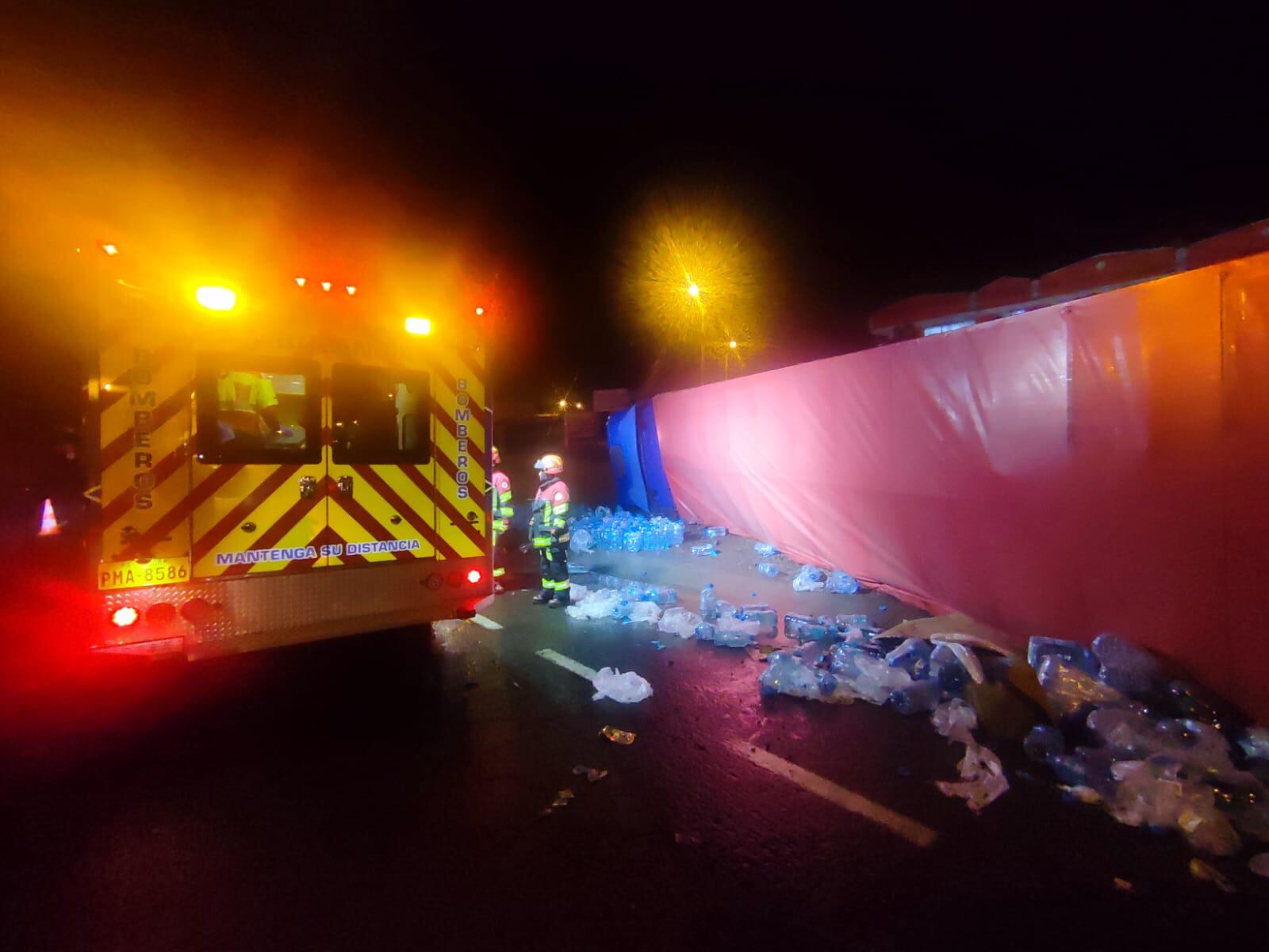 Un siniestro de tránsito se registró la madrugada de este martes en la avenida General Rumiñahui, sector de Amaguaña, en Quito. Un tráiler que transportaba aguas embotelladas perdió pista y volcó, dejando cinco personas heridas.