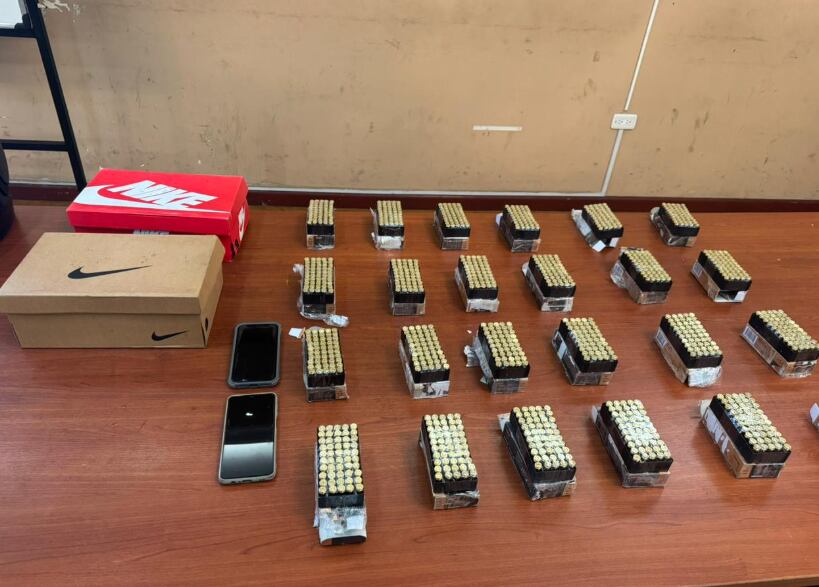 Tras interceptar el vehículo, los agentes realizaron un registro superficial a los dos ocupantes y posteriormente una inspección minuciosa al automotor. En la parte trasera encontraron dos cajas —una roja con logotipo de Nike y otra café con el distintivo “Do It”— que en su interior contenían 24 cajas de municiones calibre 9 mm Luger, marca Bronze, cada una con 50 cartuchos sin percutir.