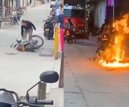 Un video que circula en redes sociales muestra el momento en que una mujer, en San Roque, Antioquia, incendió la motocicleta de su esposo tras descubrir su infidelidad.