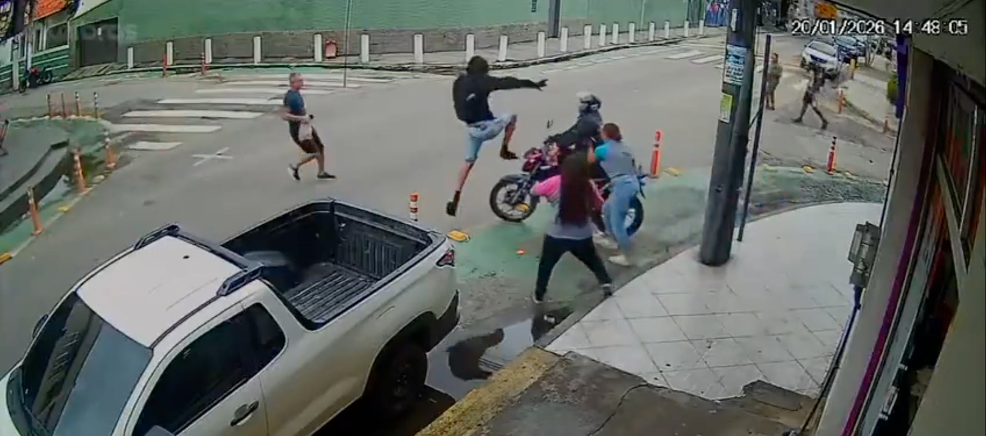 En el video se observa cómo una segunda mujer sale del negocio y no logra intervenir para ayudar a la víctima. La mujer, en un intento de defensa, utiliza su bolso para golpear al presunto delincuente mientras este intenta subirse a su motocicleta para escapar.