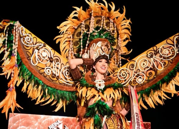Este atuendo incorpora elementos como yute, madera, mate, coco, cabuya y plumas, con los cuales se rinde homenaje a la ancestral civilización Jama Coaque, una cultura precolombina de la costa ecuatorial conocida por su estrecha relación con la naturaleza, el culto al sol y la expresión artística.