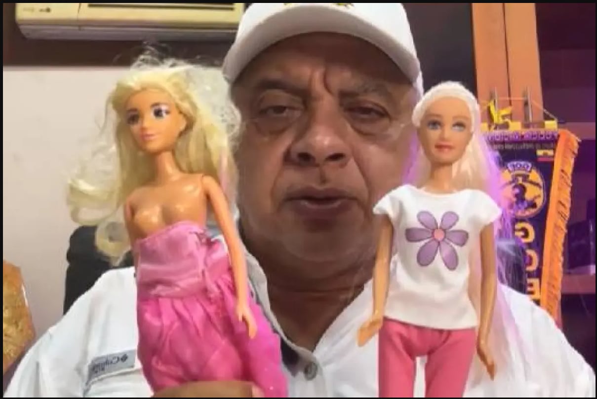 La puesta en escena no terminó ahí; Lara también utilizó dos muñecas tipo Barbie para parodiar a las supuestas secretarias del funcionario.