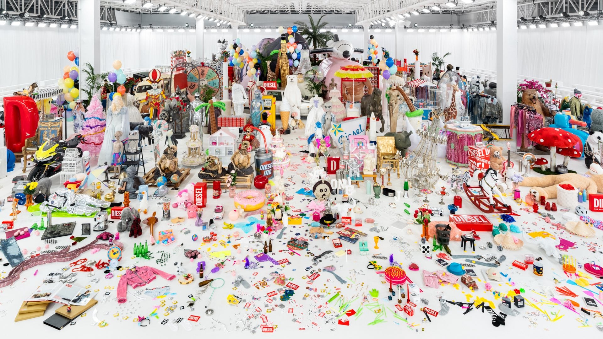 Durante la Semana de la Moda de Milán, Diesel presentó un escenario repleto de más de 50.000 accesorios reutilizados, inflables y recuerdos de la historia de la marca