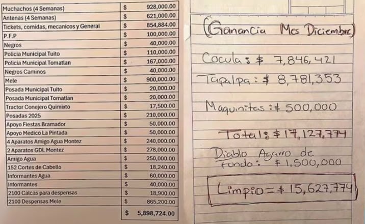 Según los documentos, solo en diciembre de 2025 la organización habría obtenido ganancias por aproximadamente USD 516.550 (8’781.353 pesos mexicanos) por la venta de marihuana, cocaína, metanfetamina y fentanilo, además del control de máquinas tragamonedas en Tapalpa.