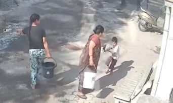 En las imágenes se observa que la mujer caminaba por la calle sosteniendo un recipiente con agua aparentemente caliente. En ese momento, el niño salió de una vivienda con un pichkari, una especie de jeringa de plástico utilizada tradicionalmente para lanzar agua de colores durante celebraciones como el festival Ranga Panchami, popular en varias regiones de India.