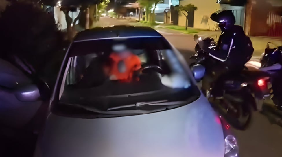 Según las imágenes difundidas, los uniformados se acercan al vehículo —cuya puerta estaba abierta— y descubren a la pareja en pleno acto.