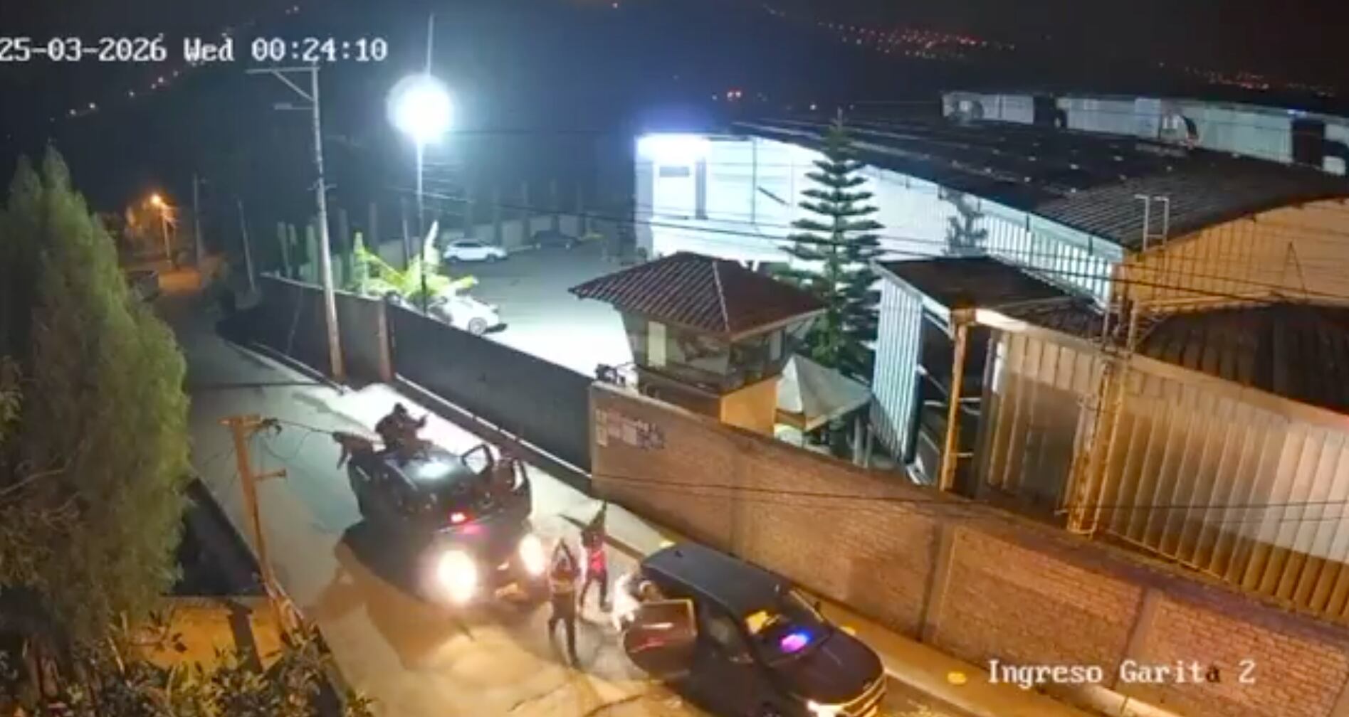 Según las imágenes, tres vehículos, aparentemente blindados y con luces similares a las patrullas policiales, se acercaron a la entrada de la fábrica. De los automóviles descendieron varios hombres con uniforme policial, quienes amenazaron con armas de fuego a los guardias del lugar.
