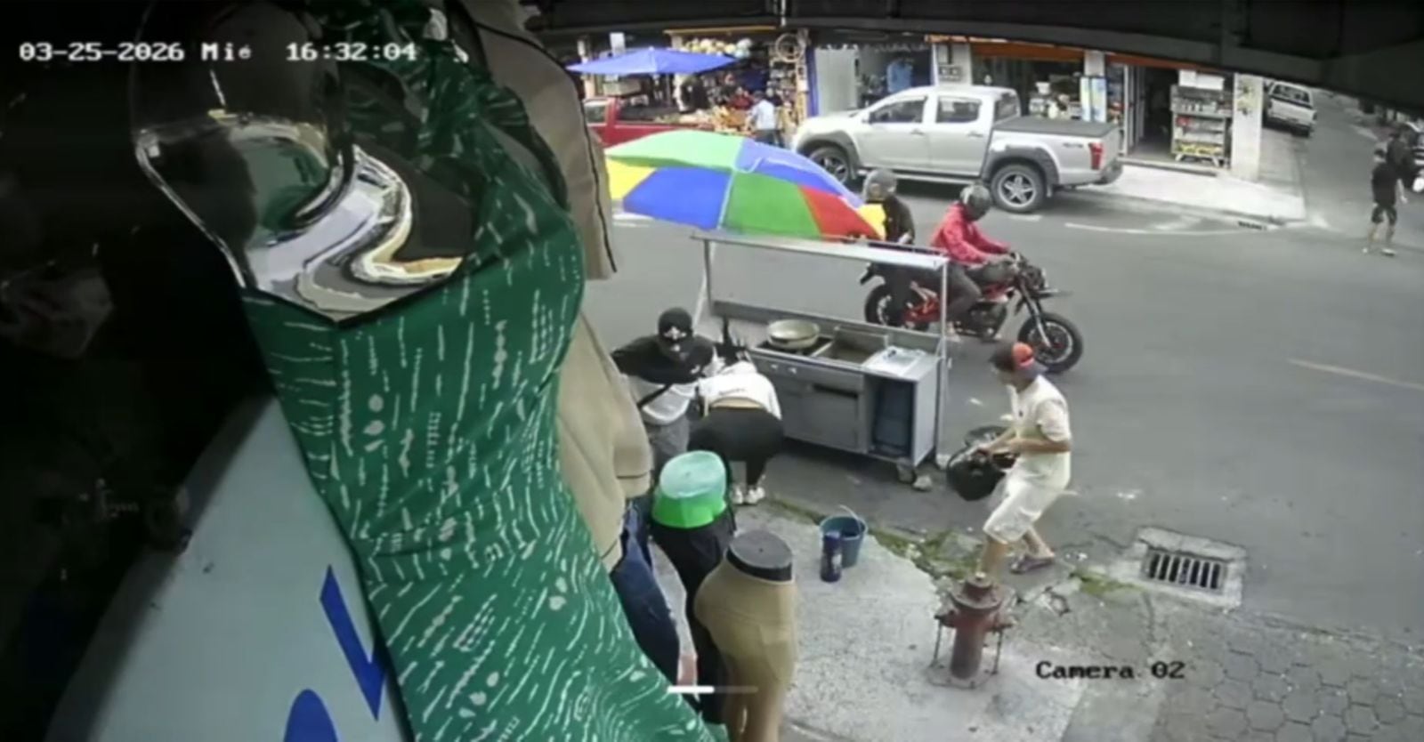 El ataque ocurrió alrededor de las 16:32, en la intersección de la avenida Galo Plaza Lasso y Pedro Carbo. En las imágenes se observa a varias personas organizando lo que sería un puesto de comida, cuando de pronto sujetos a bordo de una motocicleta pasan a toda velocidad y abren fuego.