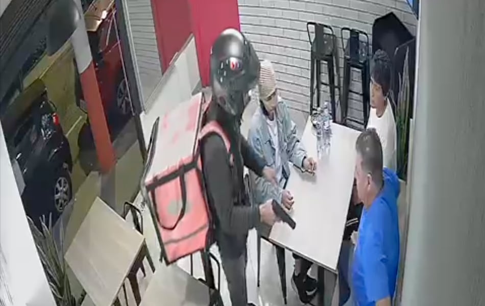 En las imágenes se observa cómo apunta con un arma de fuego a los comensales mientras ejecuta el asalto.