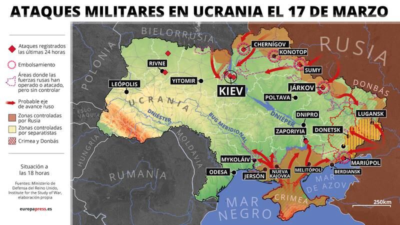 Además, 1.9 millones de personas son desplazados internos, es decir, han abandonado sus hogares pero permanecen dentro de Ucrania. El Programa de Naciones Unidas para el Desarrollo (PNUD) estima que, como consecuencia del conflicto, hasta el 90 por ciento de la población ucraniana puede sufrir pobreza o una vulnerabilidad económica extrema.